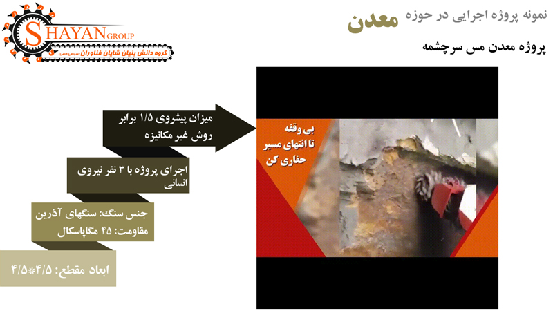 Sarcheshmeh copper mine is located 160 km southwest of Kerman and is the largest copper producer in Iran. In one of the underground sections of this large mine, for the first time, mechanized underground excavating was carried out by the Shayan Roadheader, which significantly increased the efficiency. In this project, the work front was made of igneous rocks with a resistance of 45 MPa, which was excavated in a cross section of 4.5 meters by 4.5 meters.