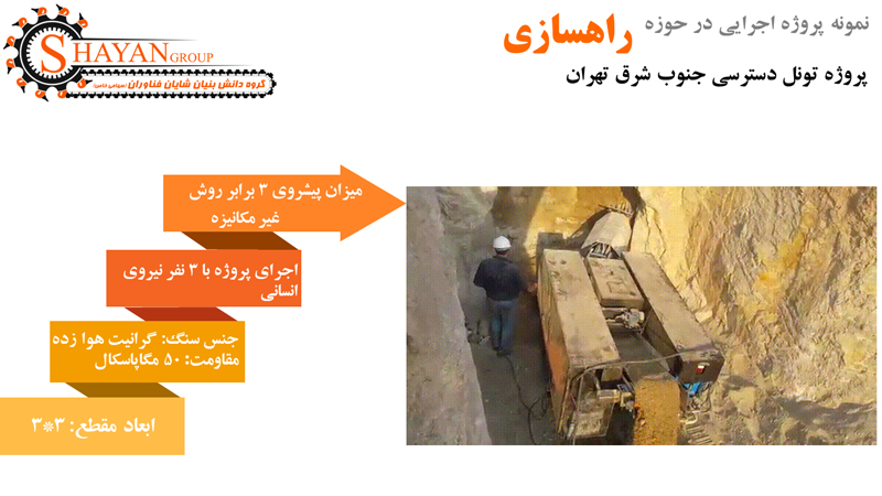 A tunnel with dimensions of 3 meters wide and 3 meters high with the shape of a horseshoe cross section was excavated by Shayan Roadheader. The front stone was made of aerated granite, which with a compressive strength of 45 to 50 MPa, made the excavating conditions difficult. Due to the presence of joints and cracks in the mass of the work front stone in this project, after each meter of excavating progress, it was necessary to maintain the roof and walls in the form of steel mesh with concreting. Roadheader is one of the best options for constructing small and short tunnels in and out of the city.