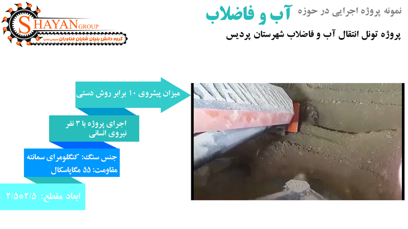 In one of the executive projects, which was carried out by using Shayan Roodehdar, a tunnel 120 meters long, 2.5 meters wide and 2.5 meters high was excavated to transfer water and waste water from the new city of Pardis to the Pardis treatment plant. This tunnel was excavated in a working front made of Samante conglomerate rock with a high degree of cementation and a compressive strength of about 60 MPa. In terms of location, this project was located as an underpass under the old road and Tehran-Bumhan highway, next to Pardis Azad University, which started at a depth of 13 meters below the ground, and ended at 21 meters below the ground. Below, you can see a video of the different stages of this project with its specifications table: